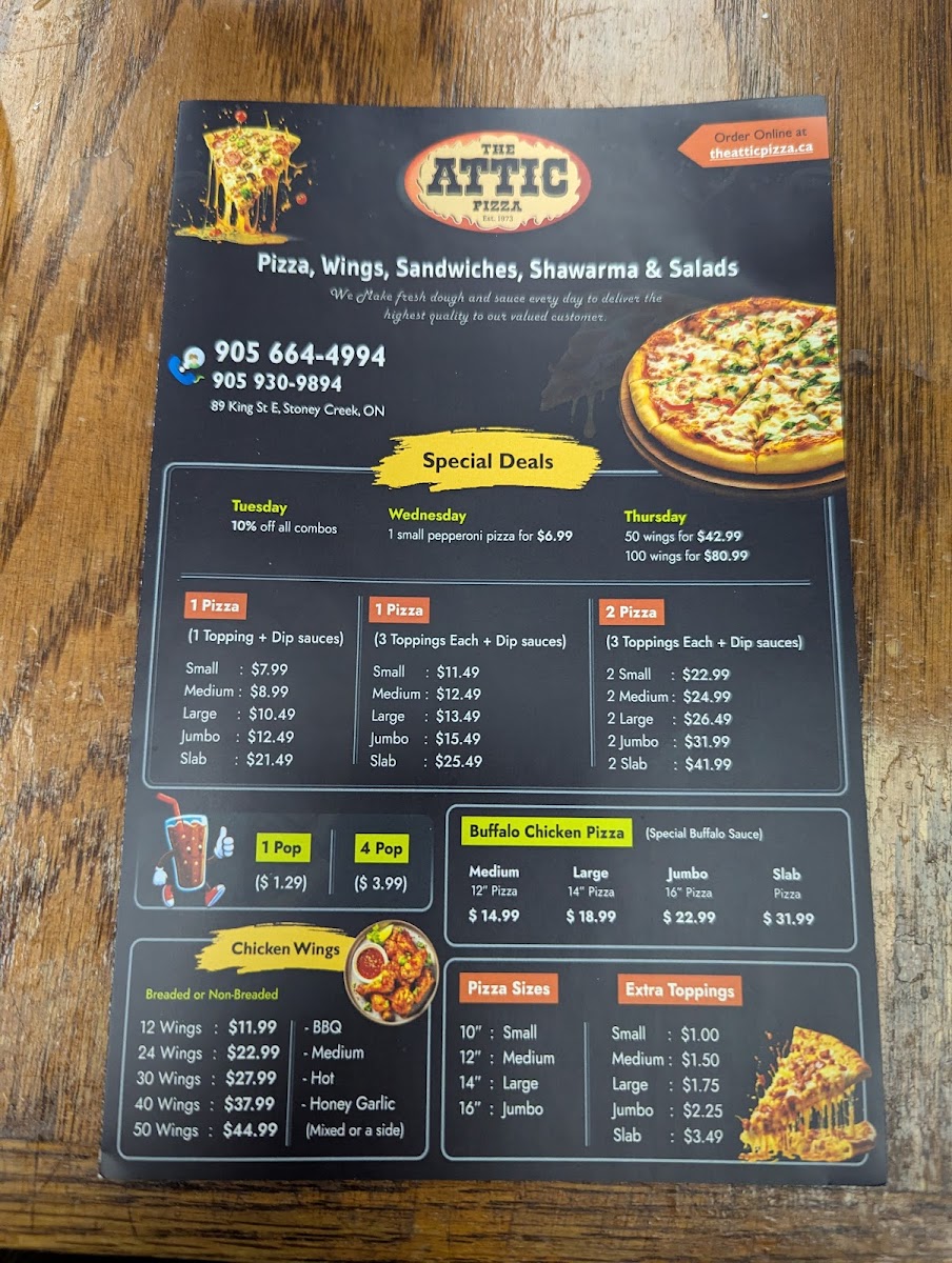Welcome to The Attic Pizza Parlour, a delightful takeaway destination located at 89 King St E in Stoney Creek, ON. This charming pizzeria has quickly carved out a niche in the local food scene with its delicious offerings and warm customer service.